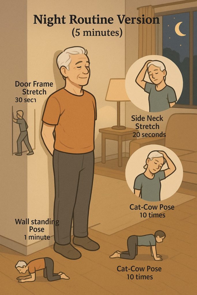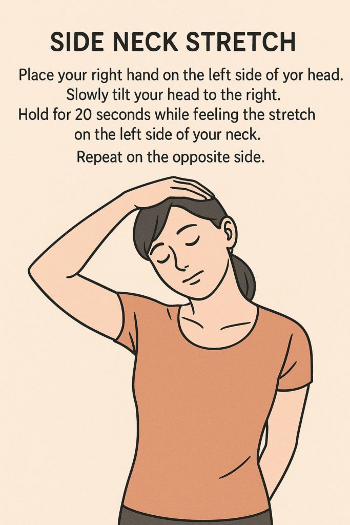 - 首の横伸ばしストレッチ – 左右20秒ずつ