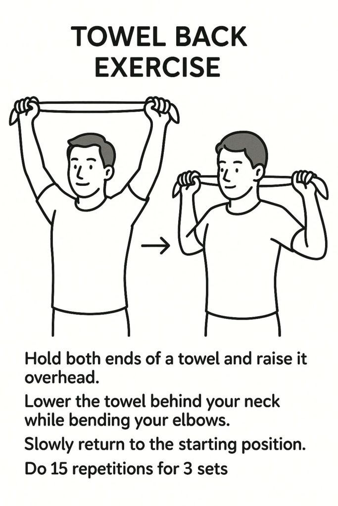 - 肘を曲げながらタオルを首の後ろまで下ろす